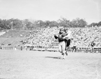 Bob Warren, Arkansas end, closes his eyes against impending shock as he comes down with the ball, and with the TCU Horned Frogs, Ray McKown around his neck.