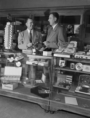 J. E. Pulliam Junior, left owner of the Camera Shops, who opened an establishment at 3116 W. 6th St, and J. Marcus Brown, manager, display one of the items being offered in the new shop.