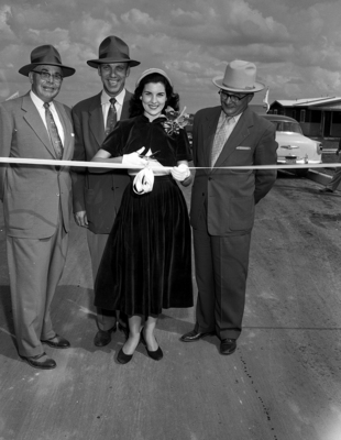 Miss Jackie Summers of Lake Worth is shown scissors cutting a white ribbon to open officially the 1953 Parade of Homes. Left to right, Gus Jackson, Parade of Homes chairman; R. B. Billings, president of the Home Builders Association, and O. A. Gasaway, district director of the FHA.
