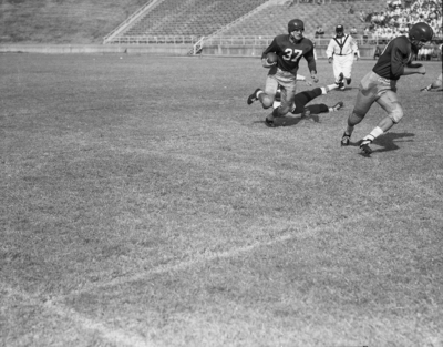 Lamar McHan, Arkansas' senior tailback will be in action against Southern Methodist University (SMU) at Dallas. A football player has the football in his arms, and two other unidentified players are in front of him.