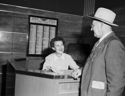 Eltie Wright of 3210 Bideker was one of the first to step up and ask Mrs. K. M. Reynolds a question at the new information booth at City Hall.