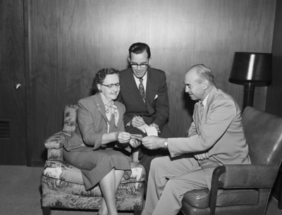 Sterling Holloway, right, general chairman of arrangements committee for the reception of GOP Chairman Leonard Hall, confers on ticket sales to the banquet scheduled for October 12. With him are Mrs. Gertrude Taylor, secretary of the executive committee of the Tarrant County Republican Committee, and D. C. Pitts Junior, a precinct chairman who will assist with ticket distribution under the direction of Mrs. Taylor.