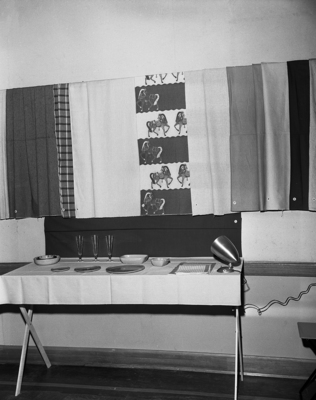 Against a backdrop of beautiful fabrics, the image shows a table arranged with pilsner glasses, pottery ash-trays dishes, as well as linen, in a showing of the effective use of objects in design at the "Useful Objects" exhibition that was held at the Fort Worth Art Association gallery at the Fort Worth Public Library. The show was arranged by Art faculty and students from North Texas State College (NTSC) in Denton. Published in the morning edition, April 23, 1950.