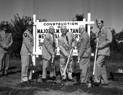 Some of the array of military and civilian officials who participated in groundbreaking ceremonies for the Major K. M. Van Zandt Memorial Armory. Left to right, Major General Hayden L. Boatner, Issac Van Zandt, Marshall H. Kennady, Mayor Deen and Colonel H. R. Hallock.