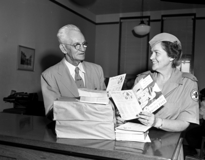 E. E. Dyes, principal of McLean Junior High School, examines United Fund material delivered by Mrs. Allen Bronston of 6224 Curzon, driver for the American Red Cross Motor Corps.