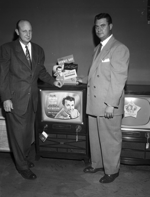 Discussing the merits of the console model television set are left, Vergal Bourland, owner of Vergal Bourland Home Appliance Stores, and right, H. D. Gatlin, who will be manager of the firm's new store in the Fair East shopping center.