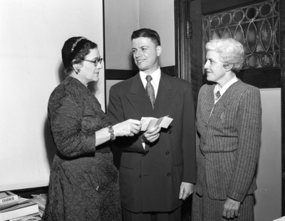 Mrs. Myrtle Lane, left, Soroptimist Club president, presents a check from the group to Thomas H. Law, president of the Fort Worth Crippled Children's Society. Dr. Mary E. Karraker is executive director of the society which has established a fund for adult rehabilitation and treatment.