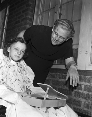 Elizabeth Fuller, 8, plays with her toy piano from her wheel chair at St. Joseph's Hospital, where she is recuperating from lockjaw. Her mother, Mrs. W. H. Fuller, stands nearby.