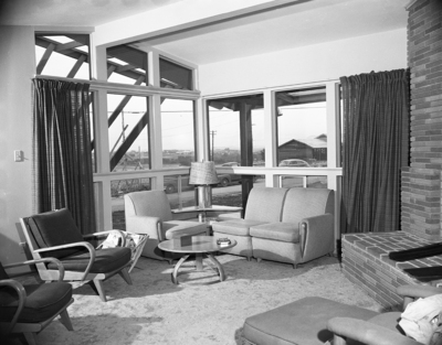 This view of the living room with its mullioned corner windows is in the new home of Mr. and Mrs. S. V. Schacht McCollum, 6701 Woodstock.