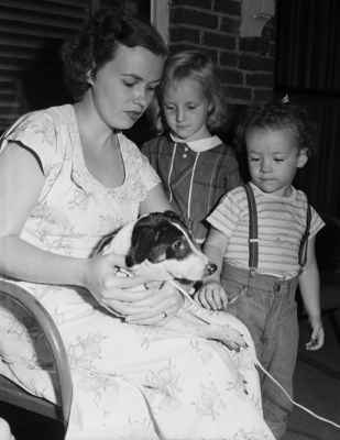 Holding the dog which withdrew under her home nearly a month ago is Mrs. Charles H. Murphy, 3209 W. 6th Street. Trying to make friends with the pup are Irene Closson, 5, center, daughter of Staff Sergeant and Mrs. Stanley Closson, and Kathie Murphy, 3, daughter of Captain and Mrs. Murphy. The Clossons live at 3211 West 6th Street, the west side of the duplex the dog chose for its hideout.