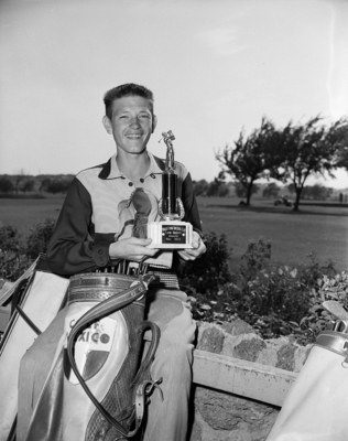 Orra (Tiny) Evans gives with big grin as he displays championship trophy won in Glen Garden Country caddy meet. Evans beat Norman Hamilton in finals.