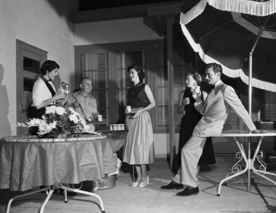 Enjoying refreshment, left to right are Airman first class Jean Dake, a volunteer worker, Master Sergeant John Boyle, club steward; Airman first class Beverly Thomas, Airman first class Pat Oursland, and Airman second class Scott West. The newest service club at Carswell Air Force Base is an ideal sport for service personnel and their families to relax. Published in the Fort Worth Star-Telegram, August 30, 1953.