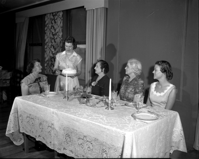 Left to right, Mrs. Charles L. Waller, Mrs. L. B. Tennison Jr., Mrs. William Head, Mrs. Jerome Parker, and Mrs. Edward E. Dean. Five woman wearing dresses sitting and standing at a fancy dinner table, and the table has plates, glasses, and candles.