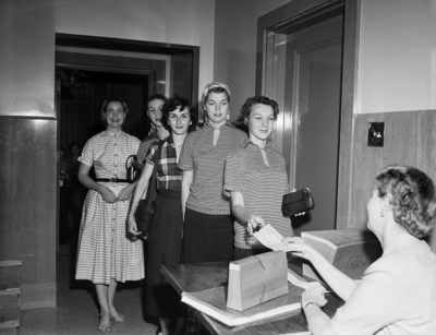 Among the striking Southwestern Bell Telephone Company switchboard operators here who went to the downtown main office to pick up paychecks due them Friday are, left to right, Louise Hogan and Mary Jo Vaughn of 3625 Bunting Avenue, Mrs. Eloise Petersen of 1515 Pruitt and Jean Wise and Betty Vaughn of the Bunting address. Seated is Mrs. Pearl Taylor of 1440 Eagle Drive, a supervisor who passed out the checks.