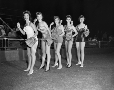 Picked for finals in first half of judging Friday night in Queen-of-the-Cats contest were, left to right, Jackie Summers, Glyna Mathis, Mary May Peterson. Myrna King and Peggy Scallorn. They pose in a line going to throw a baseball, with a baseball glove and a cap. The queen will be announce Saturday night, August 22 at La Grave Field.