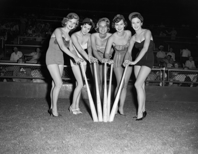These candidates for "Cat Queen" were picked Friday. Left to right are Beverly Burmeister, Nathalie Owen, Mary Ruth Brown, Glenda Collier, Gaylynn Baker. The finalists pose holding baseball bats in a semi circle. The queen will be announced Saturday, August 22 at La Grave Field