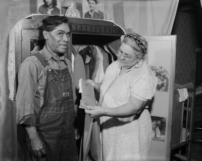 Looking over civilian clothes Corporal Vincent Aguilera hasn't worn in five years are his aunt and uncle, Mr. and Mrs. Pete Mendoza of 1705 Elm. Aguilera was released Friday, August 21 in the Korean armistice POW exchange. He served at Headquarters, 2nd Battalion, 5th Regimental Combat Team, 24th Division.