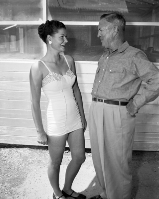 A parade, bathing beauty contest and selection of a queen opened Reagan County's two-day golden anniversary celebration. Mrs. Jim Sawyer of Benedum Pool, Reagan County, an entry in the beauty revue, talks with Snipe Conley, a 25 year employee of Big Lake Oil Company. Conley is a pumper tending Reagan County's discovery well which has been producing 30 years. Mrs. Sawyer was the first child born at Texon, oil camp town of Big Lake Oil Company. Conley was once a Texas League pitcher.