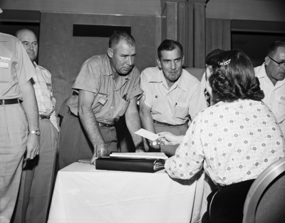 SFOA (Southwest Football Officials Association) - John Hart of Abilene, left, and J. C. Shockey, Fort Worth, check in with Mrs. W. A. Freeman as grid officials convene in Hotel Texas.