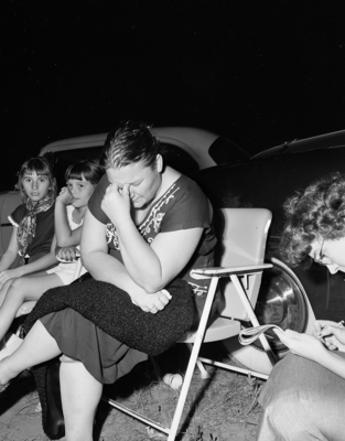 Mrs. John Edgar Phillips holds head in hand while waiting for word about her husband. Phillips and his friend, Dumont M. Ruterford Sr. and son D. M. Rutherford Jr., 3, were riding in a motorboat when it capsized. The body of Phillips had not been recovered by midnight Sunday as more than a dozen boats searched.