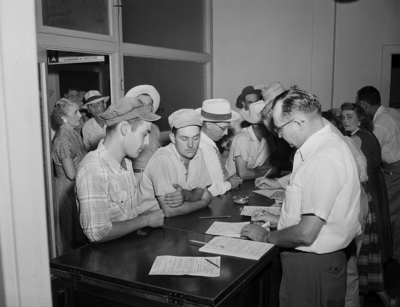 Tarrant County farmers lined up Monday morning to apply for drought relief feed. Making applications here are, left to right, Jack Cobb and Harold Hampton, Crowley dairymen, and Harold E. Jarvies, Keller stock farmer. Receiving the applications is M. M. Wright, county Production and Marketing Administration (PMA) administrative officer. They are applying to the State Drouth Relief Committee for shipment of cheap feed.