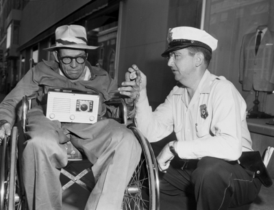 Patrolman W. G. Turner gives Tobe Ersery a pocket watch after looking unsuccessfully for two months for the thief who stole the man's old watch. Ersery's watch was stolen then he attempted to wheel his chair up onto the curb after crossing the street at 9th and main on June 30, when an overall-clad man walked by and snatched the watch chain away.