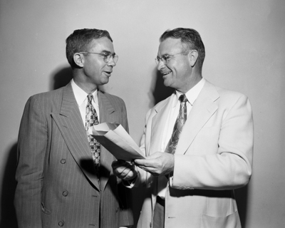Andrew Q. Allen of Dallas, right, president of the Southwestern Baptist Religious Education Association, discuss the convention program with Lattimore Ewing, education director of First Baptist Church of Lubbock. Ewing is a principal speaker on the three-day conference which opened at Southwestern Baptist Theological Seminary.