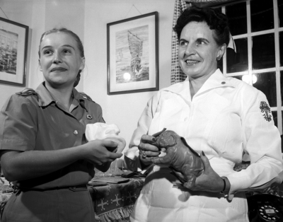 Creative Art - Specimens of clay modeling by patients at United States Public Health Service Hospital are held by Mrs. Russell O'Neal, left, Red Cross chairwoman of arts and skills volunteer aides there, and Miss Lenore Brannon, OTR, chief occupational therapist on staff. Finger paintings are on the wall.