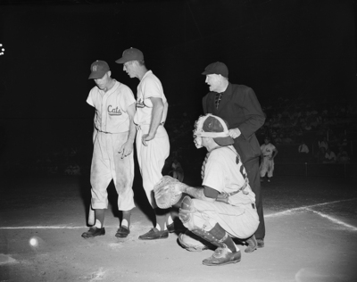 Manager Max Macon of the Cats, center, intercedes to quiet Gale Wade as the latter argues with Umpire Bud Newman in the second inning of the Fort Worth- San Antonio game at La Grave Field Wednesday night. The waiting Mission Catcher is Charley Hopkins. Argument was over a called strike.