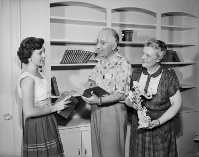 Dr. J. Howard Williams, flanked by Mrs. Williams, right, and daughter Floy Kate, puts up books in their new home at 4441 Stanley. He is new president of Southwestern Baptist Theological Seminary. The daughter will be a junior at Baylor University this fall. The Williamses have four other children, all married except Kelly Dan, a University of Texas law student.