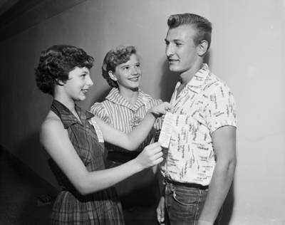 Ann Wheeler, left, of 3058 Rogers, and Sarah Hickey, 3200 Lipscomb, greet Jim Pugh of Austin with a badge and a big smile as he arrives at Texas Christian University (TCU) for the 10th annual Texas Youth Convention of the Christian Church. The meeting will last through Friday.