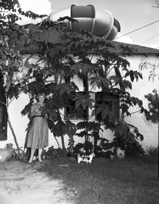 Mrs. James O. Burdick stands beneath a 13-foot castor bean plant at her home, 3215 Azle Ave.