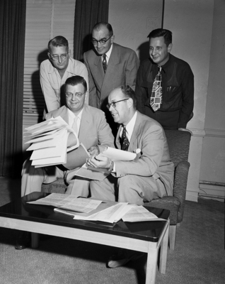 Television progress was the topic at Hotel Texas. Seated Hal Chase, left, and Truett Kimzey, right, Standing, left to right, Leonard R. Smith, Paul H. Wendel, and Will A. Shaw.