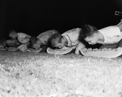Watermelon contestants, A group of Little Leaguers, left to right, Jerry Shelton, 10, Kenny Pierce, 12, and Alan Price, 12. They are all hands behind their back and eat watermelons.