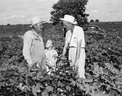 W. E. Webb, left, who operates a successful diversified farm in Hill County, looks at some of his good cotton with County Agent Charlie Clark and Webb's 8-year-old daughter, Pattie.