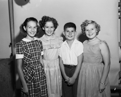 Marie Smith, Carolyn Higgins, Jimmie Norris, Evelyn Higgins, Donald Smith, and Bobby Davis. Participants in the Milk & Ice Fund Circus.