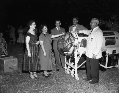 Left to right, Mrs. Mildred Garlitz, Mrs. Eva Terry, Harry Murray, Robert J. Smith, and Judge John Rawlings. Presented two iron lungs to the National Foundation for Infantile Paralysis.