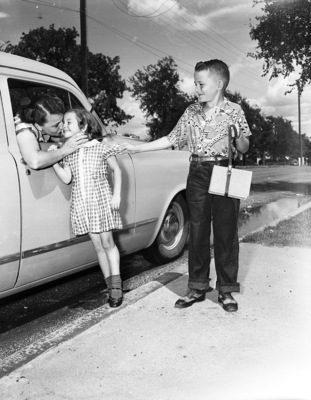 Mrs. A. P. Steinmetz kisses daughter Carolyn goodbye as she starts to school while son Paul looks on