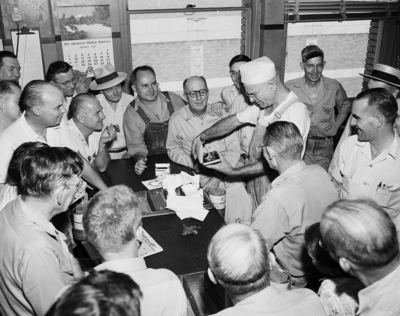 Series on Si Addington with retirement gifts. Shown is a man opening gifts, and there is a crowd of other men surrounding him.