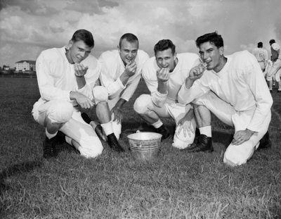 Probable starting backfield for Texas Christian University (TCU) football team in season inaugural with Kansas September 19 takes time out to eat some ice drills got under way. Left to right are Halfbacks Ronald Fraley and Ronald Clinkscale, Quarterback Ray McKown and Fullback Sammy Morrow.
