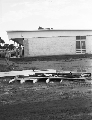 Section of the roof blown from the Oak Ridge Grocery at Pantego, came to rest in a splintered pile at the side of the building.