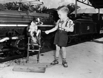 Pepper, 6-year-old Boston terrier, oversees ticket-taking at the miniature train on S. Riverside Dr. but she much prefers to ride. Jerry Martin, 4, son of Mr. and Mrs. H. R. Martin of 2617 May, shows Pepper his ticket. Roy Shirley is owner of Pepper and operator of the railroad. Shirley's railroad winds around 10 acres in the Southside Play Land.