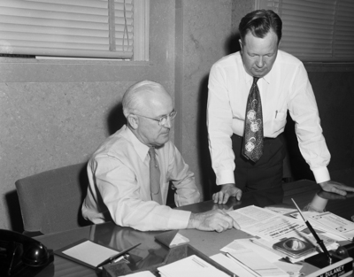 Two who note sure signs of a steady increase in Nolan County oil activity-but minus the boom and bust aspects-are J. N. Dulaney, left, board chairman of Texas Bank & Trust Company, Sweetwater, and J. L. Haney, president.