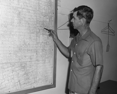 Frank Hays, abstractor, points out on a wall map where a discovery north of Old Glory set off the play in Stonewall County five years ago.