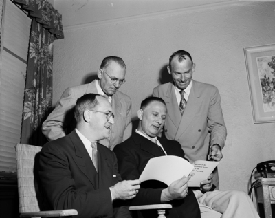 Making final arrangements for a two-day state convention of the United National Association of Post Office Clerks in Hotel Texas, were seated, William C. Armbrust, left, and Samuel E. Klein, and Standing, W. L. Davis, left, and James G. Williams.