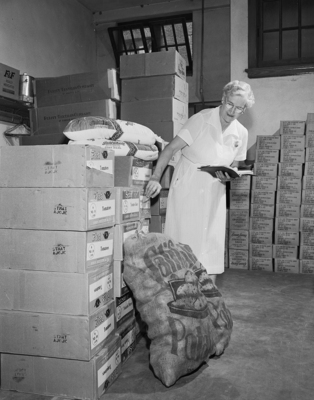 Mrs. Mattie Jackson checks inventories of food supply at Paschal.