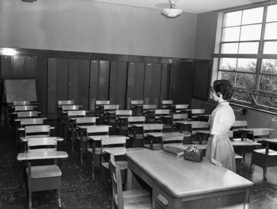 An empty classroom at S. S. Dillow Elementary School faces Miss Mary Fenichis of 1250 Terrace, her first year as a teacher ahead of her. She visited her school and looked over the vacant desks that will be filled with youngster soon. Miss Fenichis was typical of about 200 new teachers.
