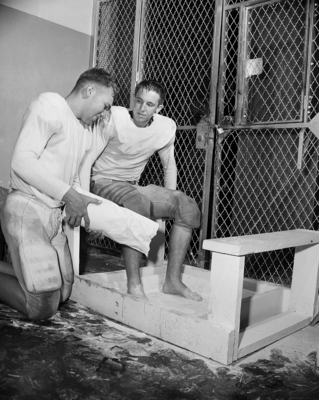 Helping Hand - Center James Sheburn assists Guard-Fullback Gary Gafford with foot bath in Amon Carter Riverside High School dressing room.