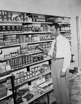 David M. Cohen, manager, examines stock at new Allied Auto Supply Store.