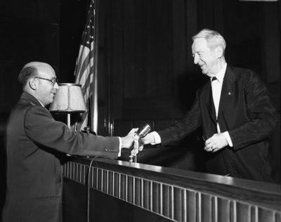 Heard L. Floore, is shown receiving congratulations from Federal Judge William H. Atwell in the U.S. Courthouse after the latter swore him in as U.S. attorney for the Northern District of Texas.